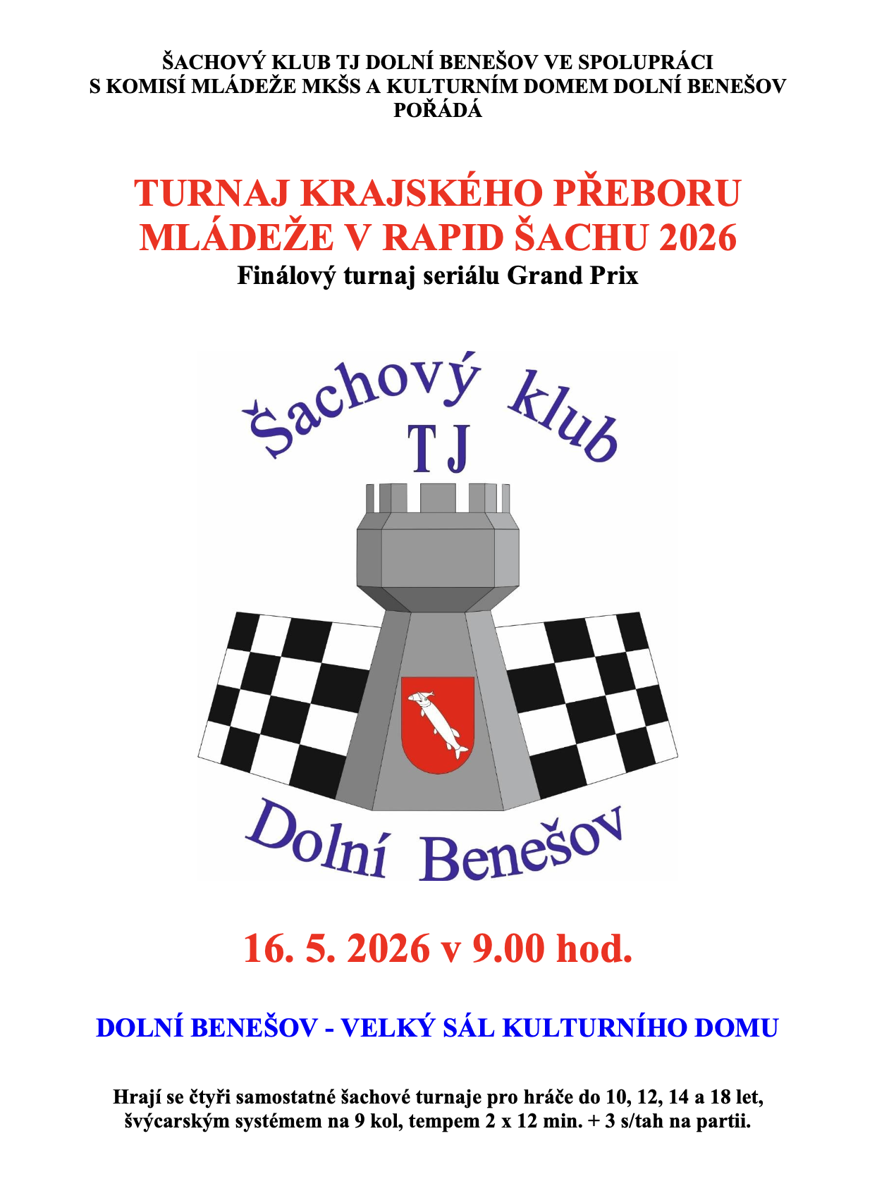 V sobotu 28.3.2026 hostila Orlová už 5. Krajský přebor mládeže v rapid šachu v této sezóně (celkově jich je 6). A i tento turnaj byl pro nás medailový, když naši borci uspěli hned ve třech kategoriích. Zlato si vybojovali Matěj Mydlář v U18 a Vojta Rybár v U12 a bronz získal Narek Hovhannisyan v U14.